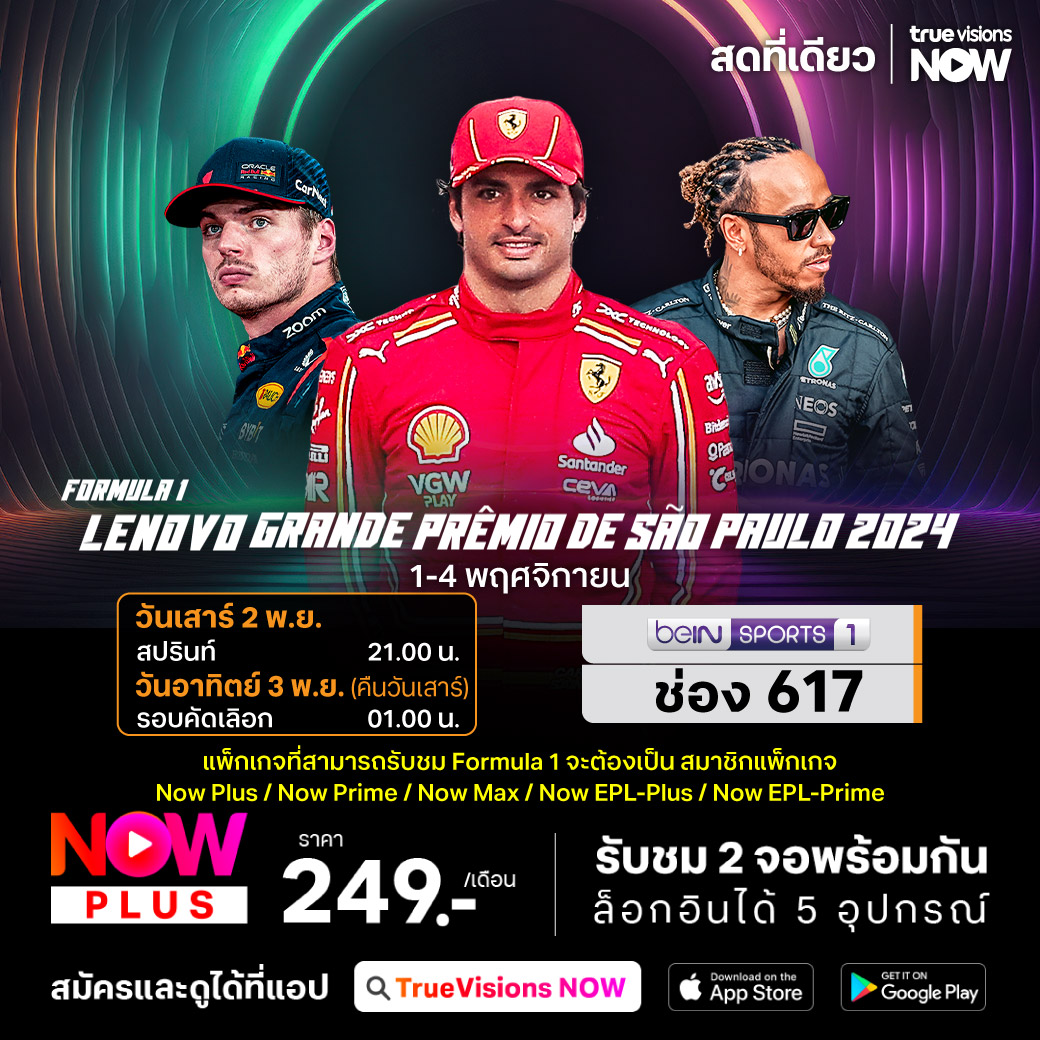 ศึกฟอร์มูล่า วัน เดินทางมาถึงสนามที่ 21 ของฤดูกาล 2024 สัปดาห์นี้พบกับรายการ บราซิเลี่ยน กรังด์ปรีซ์ ที่ สนาม โฮเซ่ คาร์ลอส ปาเช่ ในเมืองเซา เปาโล ประเทศบราซิล ทุกอันดับที่จบการแข่งขัน ทุกคะแนนจากนี้ไป มีผลต่อการลุ้นแชมป์ใน 3 สนามสุดท้าย ชมสด เอ็กซ์คลูซีฟ ทุกช่วงของการแข่งขัน ที่เดียวที่ ทรูวิชั่นส์
