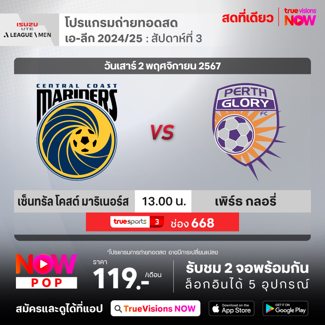 Central Coast Mariners vs Perth Glory เวลา 13.00-15.00 ทางช่อง TS 3 (668)