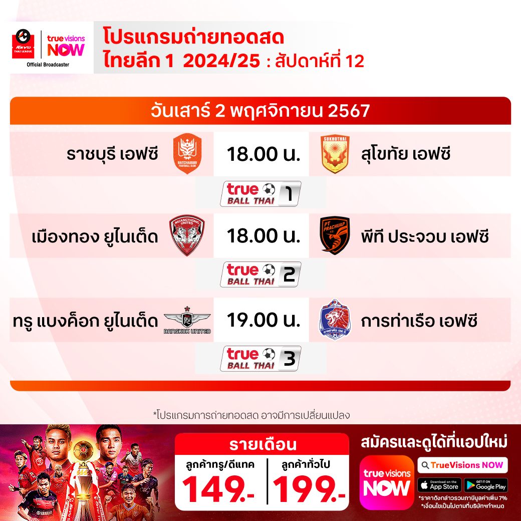 ราชบุรี เอฟซี พบ สุโขทัย เอฟซี เวลา 18.00-20.00 ทางช่อง True Ball Thai 1