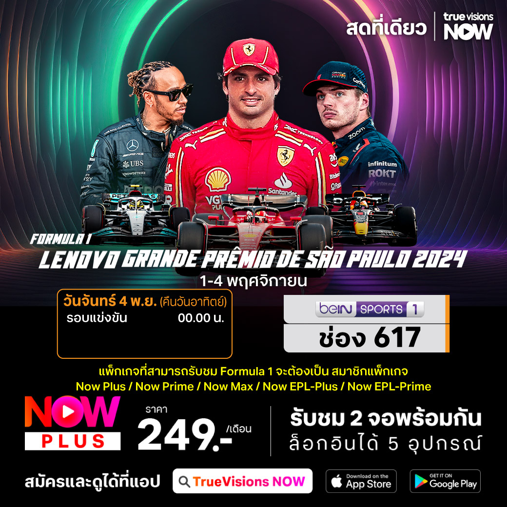 ศึกฟอร์มูล่า วัน เดินทางมาถึงสนามที่ 21 ของฤดูกาล 2024 สัปดาห์นี้พบกับรายการ บราซิเลี่ยน กรังด์ปรีซ์ ที่ สนาม โฮเซ่ คาร์ลอส ปาเช่ ในเมืองเซา เปาโล ประเทศบราซิล ทุกอันดับที่จบการแข่งขัน ทุกคะแนนจากนี้ไป มีผลต่อการลุ้นแชมป์ใน 3 สนามสุดท้าย ชมสด เอ็กซ์คลูซีฟ ทุกช่วงของการแข่งขัน ที่เดียวที่ ทรูวิชั่นส์