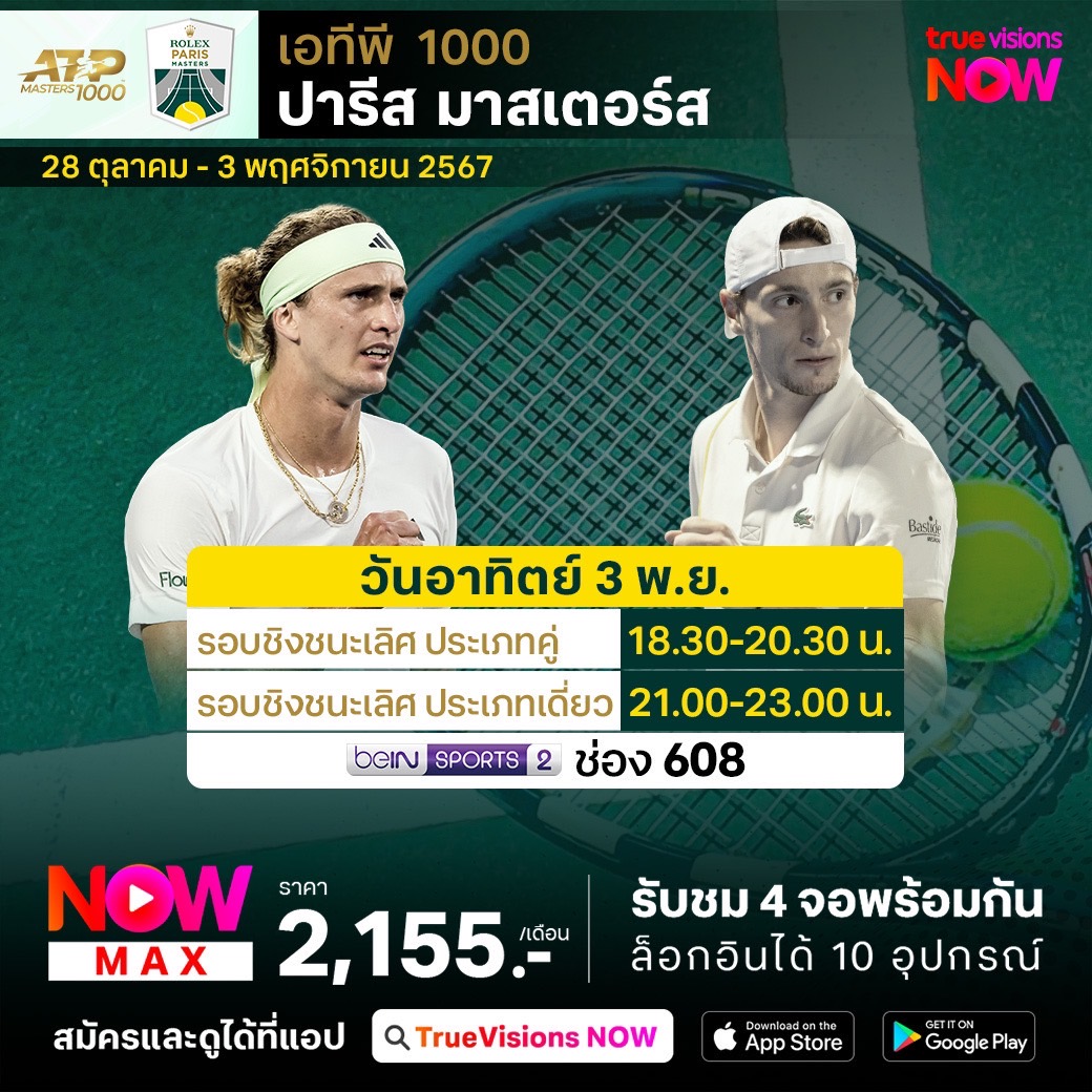 เทนนิส เอทีพี ทัวร์ สัปดาห์นี้ พบกับรายการระดับ เอทีพี 1000 รายการสุดท้ายของปี ปารีส มาสเตอร์ส ที่กรุงปารีส ประเทศฝรั่งเศส รวมนักเทนนิสระดับโลกเข้าแข่งขันกันอย่างครบครัน ทั้ง โนวัค ยอโควิช, คาร์ลอส อัลการาซ, ยานนิค ซินเนอร์ และนักเทนนิสระดับโลกอีกหลายคน ร่วมลุ้นกันว่าใครจะคว้าแชมป์เทนนิสรายการใหญ่ ระดับมาสเตอร์ 1000 รายการสุดท้ายของปีไปครอง ชมสด ครบทุกรอบ ที่ ทรูวิชั่นส์