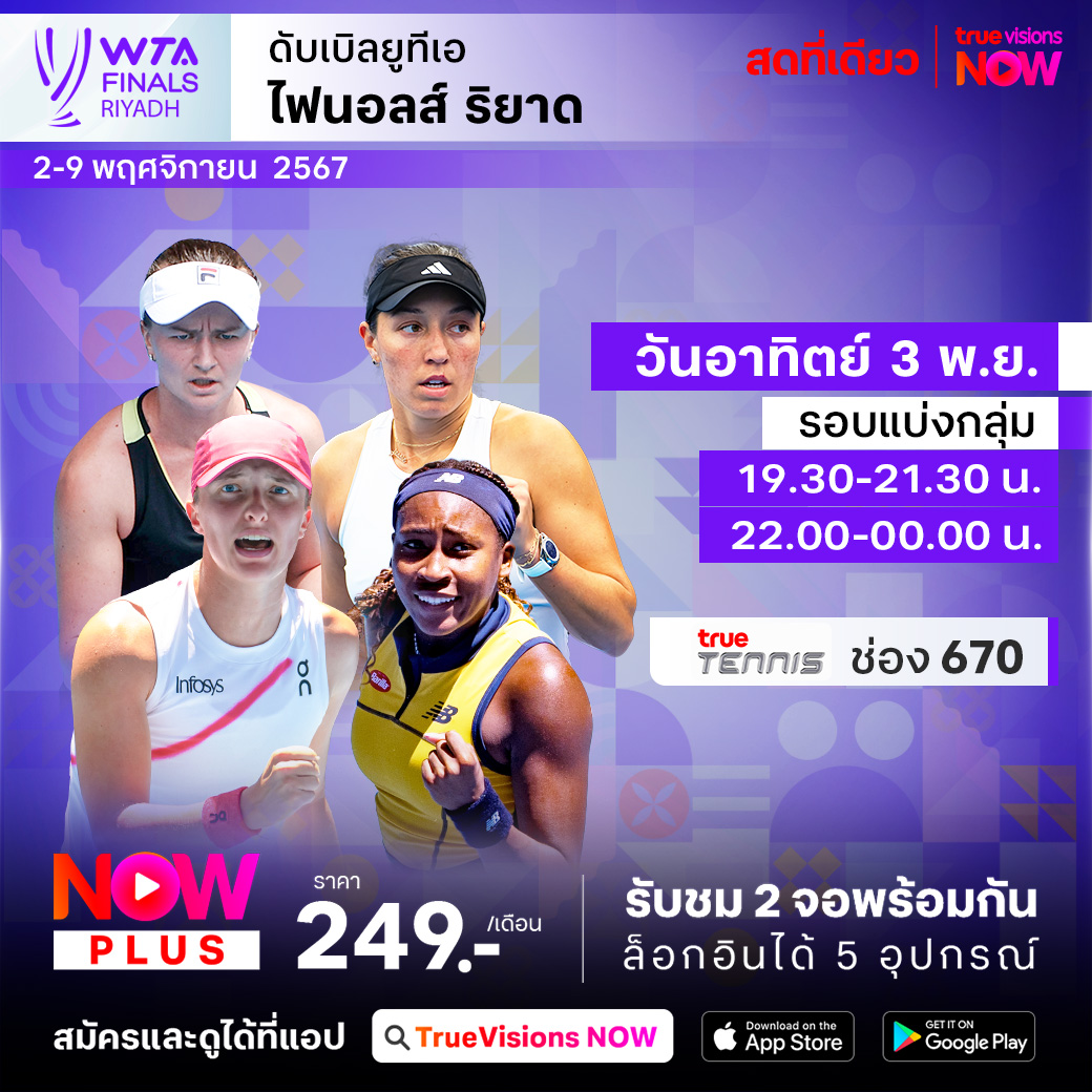 เทนนิสหญิง ดับเบิ้ลยูทีเอ ทัวร์ เข้าสู่ช่วงท้ายของฤดูกาล กับรายการที่รวมสุดยอดผู้เล่น 8 คนที่มีคะแนนสะสมในปี 2024 ที่สูงที่สุด ในรายการ ดับเบิ้ลยูทีเอ ไฟนอลส์ ที่กรุงริยาด ประเทศซาอุดิอาระเบีย ร่วมลุ้นกันว่าใครจะเป็นที่สุดของนักเทนนิสหญิงประจำปี 2024 ชมสด ครบทุกรอบ ที่ ทรูวิชั่นส์