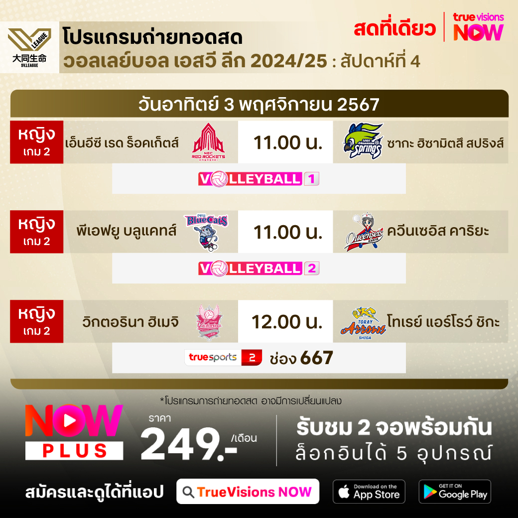 เอ็นอีซี เรด ร็อคเก็ตส์ พบ ซากะ ฮิซามิตสึ สปริงส์ เวลา 11.00 ทางช่อง Volleyball 1