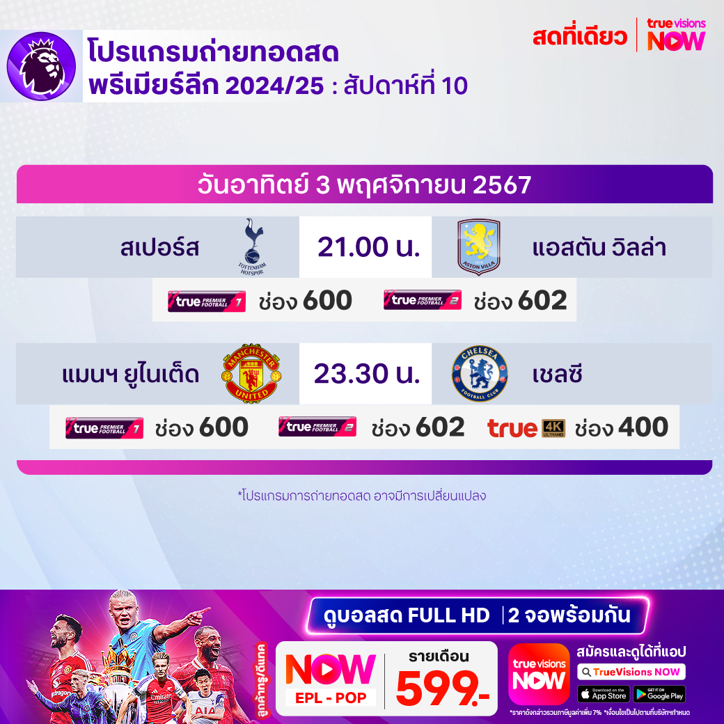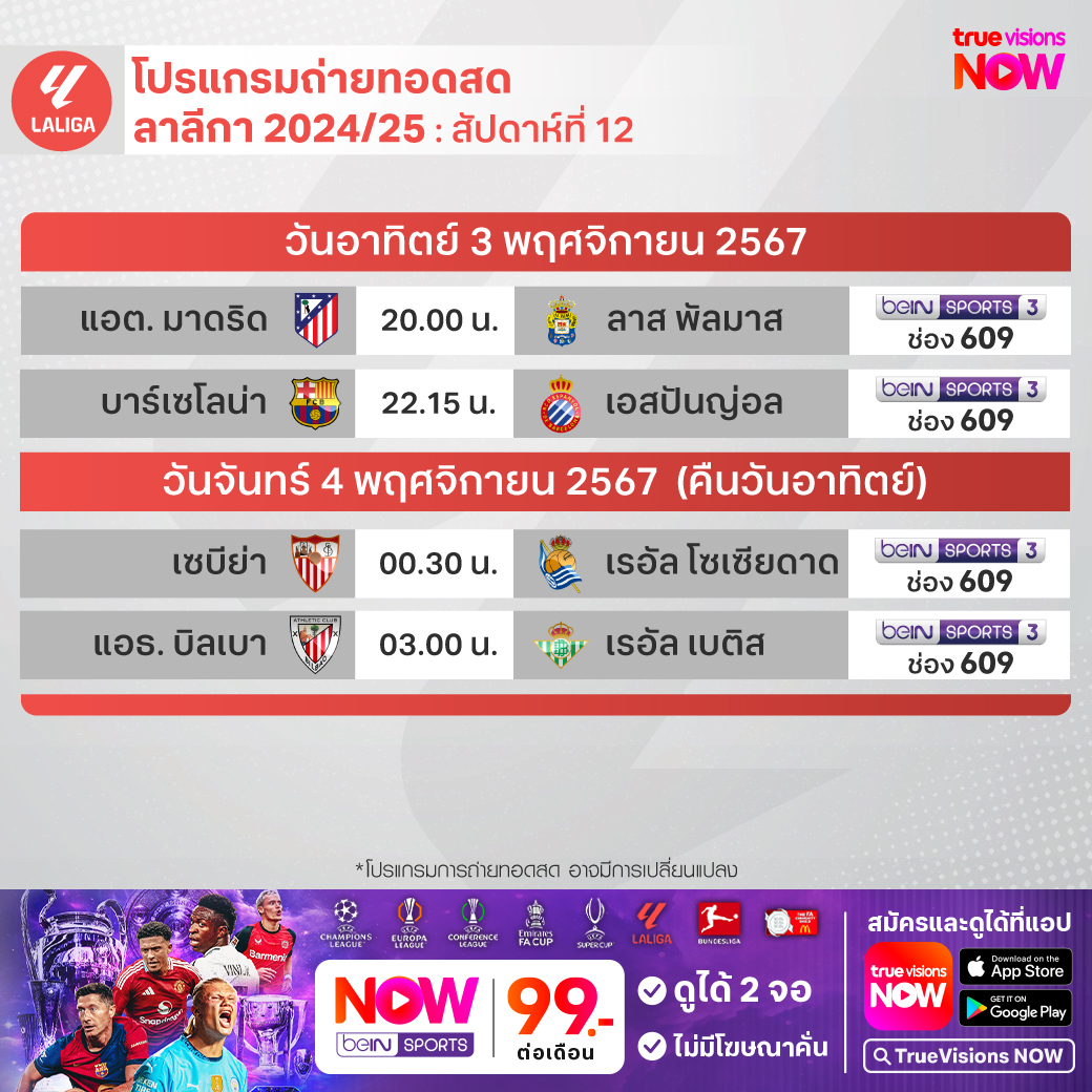 วันนี้มีอะไรดูที่ ทรูวิชั่นส์ ประจำวันอาทิตย์ที่ 3 พฤศจิกายน 67 ยังคงมีกีฬาที่น่าสนใจให้ได้ตามลุ้นตามเชียร์กันเหมือนเดิม ในส่วนของฟุตบอลนั้นยังมีศึกพรีเมียร์ลีก อังกฤษ, บุนเดสลีกา เยอรมนี, ลา ลีกา สเปน และ ไทยลีก 1, 2 ให้ได้ตามเชียร์กันต่อ ส่วนกีฬาอื่นๆ ยังมีศึกฟอร์มูล่า วัน รายการ บราซิเลี่ยน กรังด์ปรีซ์, โมโต จีพี รายการ กรังด์ปรีซ์ ออฟ มาเลเซีย, เทนนิส เอทีพี ทัวร์ รายการใหญ่ ปารีส มาสเตอร์ส, อเมริกันฟุตบอลเอ็นเอฟแอล และกีฬาที่น่าสนใจอีกมากมาย งานนี้ ทรูวิชั่นส์ จัดเต็มให้ชมกันถึงบ้าน