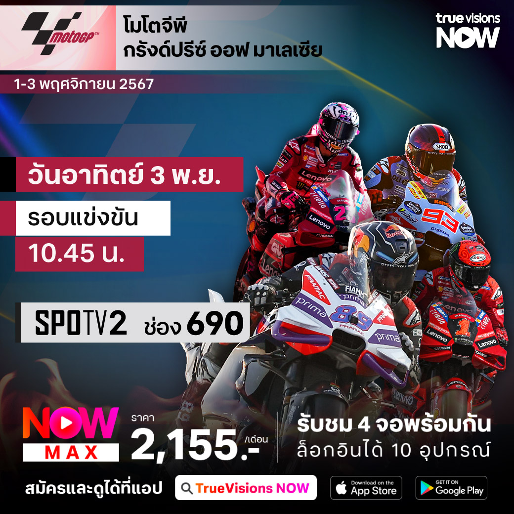 ศึกโมโต จีพี เวิลด์ แชมเปี้ยนชิพ สนามที่ 19 กับรายการ กรังด์ปรีซ์ ออฟ มาเลเซีย ที่สังเวียนสุดท้าทาย เซปัง อินเตอร์เนชั่นแนล เซอร์กิต กรุงกัวลาลัมเปอร์ ประเทศมาเลเซีย มันส์ครบทั้ง 3 รุ่นทั้ง โมโต 3, โมโต 2 ที่มี "ก้อง" สมเกียรติ จันทรา นักบิดหนึ่งเดียวของไทยให้ตามเชียร์ และรุ่นที่แฟนๆ ลุ้นกันสุดๆ อย่าง โมโต จีพี ติดตามกันสดๆ ทุกช่วงของการแข่งขัน ที่ทรูวิชั่นส์
