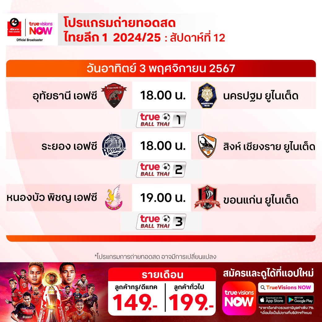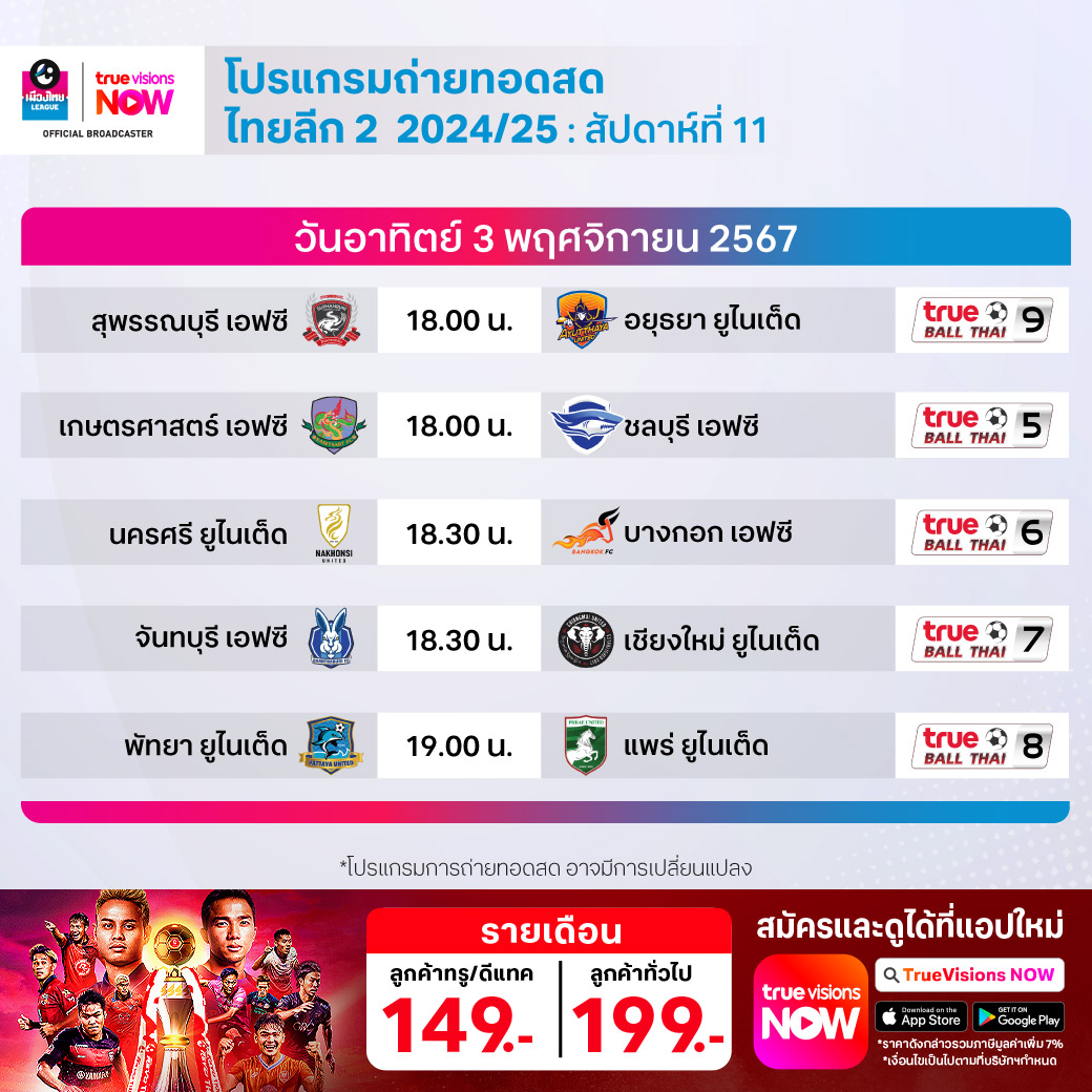 พัทยา ยูไนเต็ด พบ แพร่ ยูไนเต็ด เวลา 19.00-21.00 ทางช่อง True Ball Thai 8