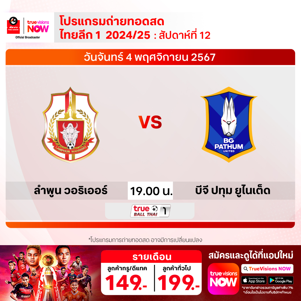ลำพูน วอริเออร์ พบ บีจี ปทุม ยูไนเต็ด เวลา 19.00-21.00 ทางช่อง True Ball Thai 1