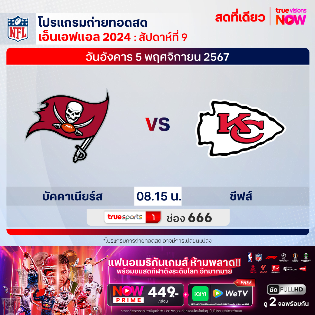 วันอังคาร 5 พ.ย. Buccaneers Vs Chiefs เวลา 08.15 ทางช่อง TS 1 (666)