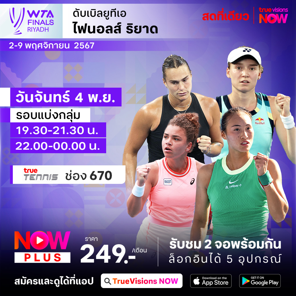 เทนนิสหญิง ดับเบิ้ลยูทีเอ ทัวร์ เข้าสู่ช่วงท้ายของฤดูกาล กับรายการที่รวมสุดยอดผู้เล่น 8 คนที่มีคะแนนสะสมในปี 2024 ที่สูงที่สุด ในรายการ ดับเบิ้ลยูทีเอ ไฟนอลส์ ที่กรุงริยาด ประเทศซาอุดิอาระเบีย ร่วมลุ้นกันว่าใครจะเป็นที่สุดของนักเทนนิสหญิงประจำปี 2024 ชมสด ครบทุกรอบ ที่ ทรูวิชั่นส์