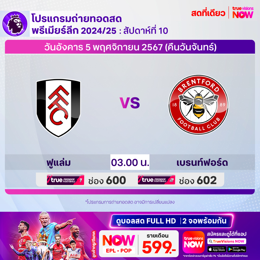 Fulham vs Brentford เวลา 03:00 - 05:00 ทางช่อง TPF 1 (600) / TPF 2 (602)