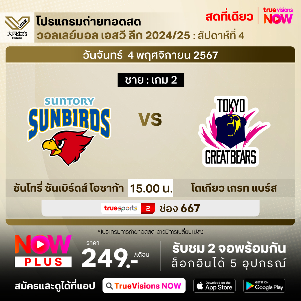ซันโทรี่ ซันเบิร์ดส์ โอซาก้า พบ โตเกียว เกรท แบร์ส เวลา 15.00 ทางช่อง TS 2 (667)