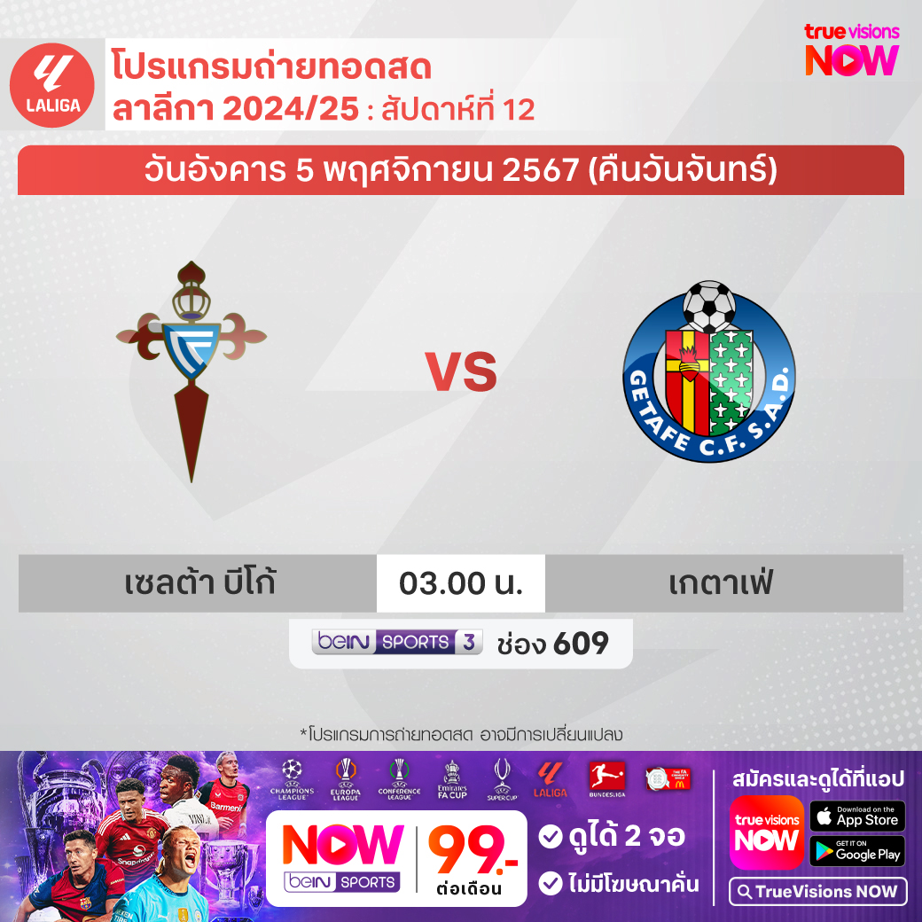 Celta Vigo vs Getafe เวลา 03.00-05.00 ทางช่อง beIN 3 (609)