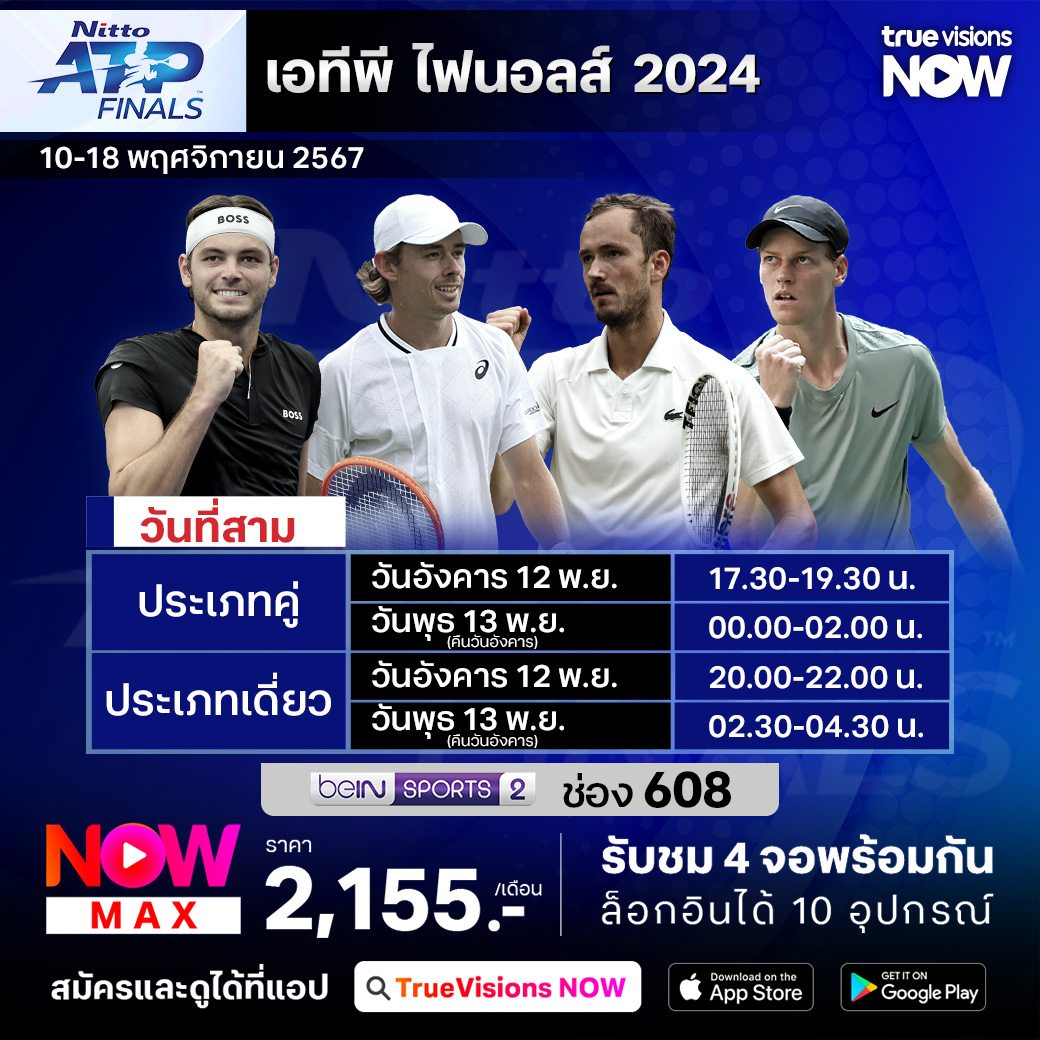 วันนี้มีอะไรดูที่ ทรูวิชั่นส์ ประจำวันอังคารที่ 12 พฤศจิกายน 67 ยังคงมีกีฬาที่น่าสนใจให้ได้ตามลุ้นตามเชียร์กันเหมือนเดิม ในส่วนของเทนนิสนั้นยังมีศึกเทนนิส เอทีพี ไฟนอลส์ ให้ได้ตามเชียร์กันต่อ งานนี้ ทรูวิชั่นส์ จัดเต็มให้ชมกันถึงบ้าน