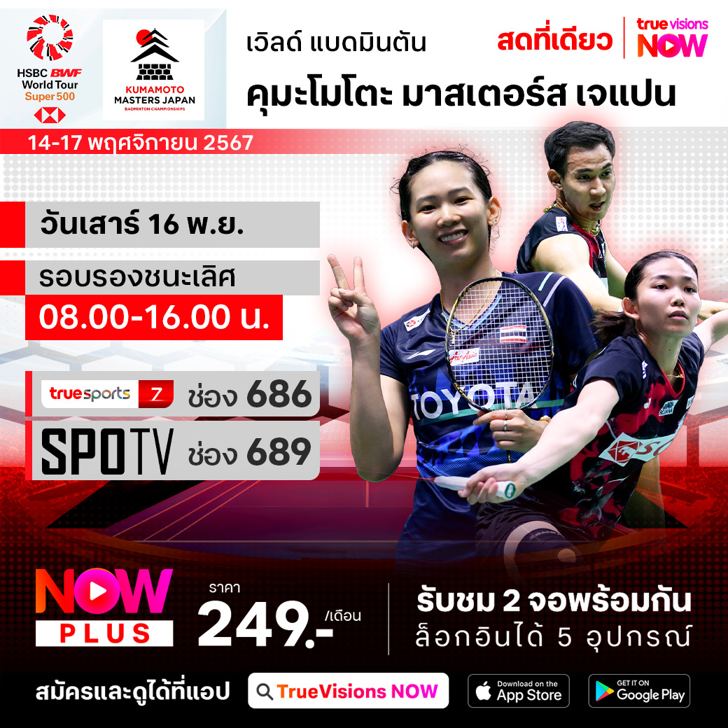 เวิลด์ แบดมินตัน รายการเก็บคะแนนสะสม คุมาโมโตะ มาสเตอร์ส แจแปน 2024 ความมันส์ระดับ เวิลด์ ทัวร์ ซูเปอร์ 500 ชิงเงินรางวัล 420,000 เหรียญสหรัฐฯ ที่เมืองคุมาโมโตะ ประเทศญี่ปุ่น ร่วมส่งใจเชียร์ทีมแบดมินตันของไทย สู้เพื่อลุ้นเก็บชัยชนะ เหนือคู่แข่งระดับท็อปๆ ของเวิลด์แรงค์กิ้งและแย่งตำแหน่งแชมป์ ชมสด เอ็กซ์คลูซีฟ ที่เดียวที่ ทรูวิชั่นส์