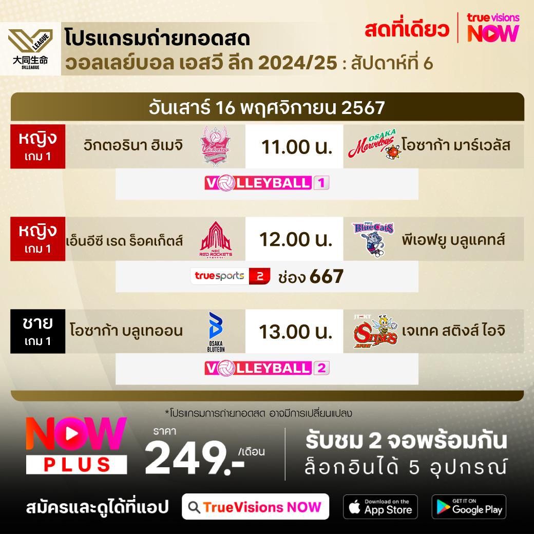 โอซาก้า บลูเทออน พบ เจเทค สติงส์ ไอจิ เวลา 13.00 ทางช่อง Volleyball 2
