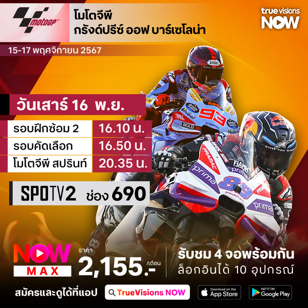แชมป์โลกปี 2024 จะตกเป็นของใคร แฟนๆ ต้องไม่พลาดกับเรซสุดท้ายของฤดูกาล 2024 ของศึกโมโต จีพี เวิลด์ แชมเปี้ยนชิพ ที่การลุ้นแชมป์รุ่นโมโต จีพี ต้องมาชี้ชะตากันที่ประเทศสเปน กับรายการ กรังด์ปรีซ์ ออฟ บาร์เซโลน่า ที่สังเวียน คาตาลุนญ่า เซอร์กิต เมืองบาร์เซโลน่า ระหว่าง ฆอร์เค่ มาร์ติน นักบิดชาวสเปน ลุ้นแชมป์ครั้งแรกกับ เป็กโก้ บันญาญ่า ที่ลุ้นแชมป์ 3 สมัยซ้อน ชมสด ครบทุกช่วง ที่ ทรูวิชั่นส์