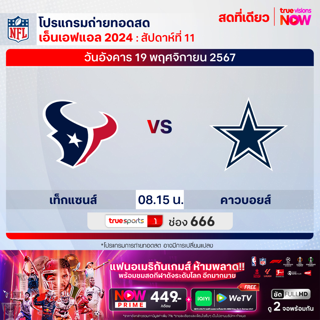 วันอังคาร 19 พ.ย. Texans Vs Cowboys เวลา 08.15 ทางช่อง TS 1 (666)
