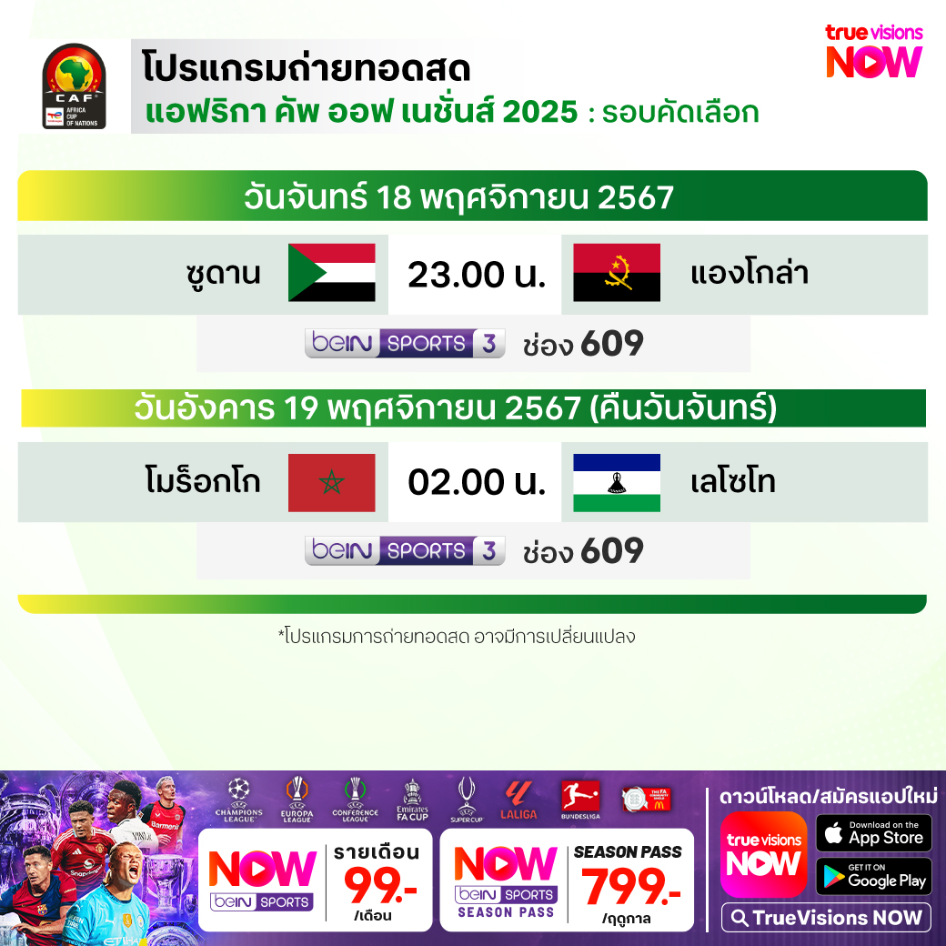 Morocco vs Lesotho เวลา 02.00-04.00 ทางช่อง beIN 3 (609)