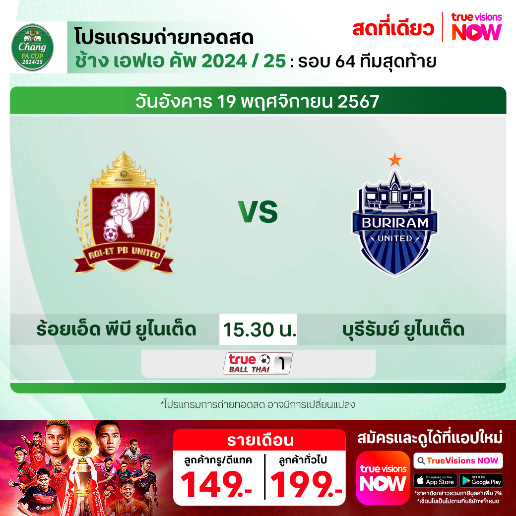 ร้อยเอ็ด พีบี ยูไนเต็ด พบ บุรีรัมย์ ยูไนเต็ด เวลา 15.30-17.30 ทางช่อง True Ball Thai 1