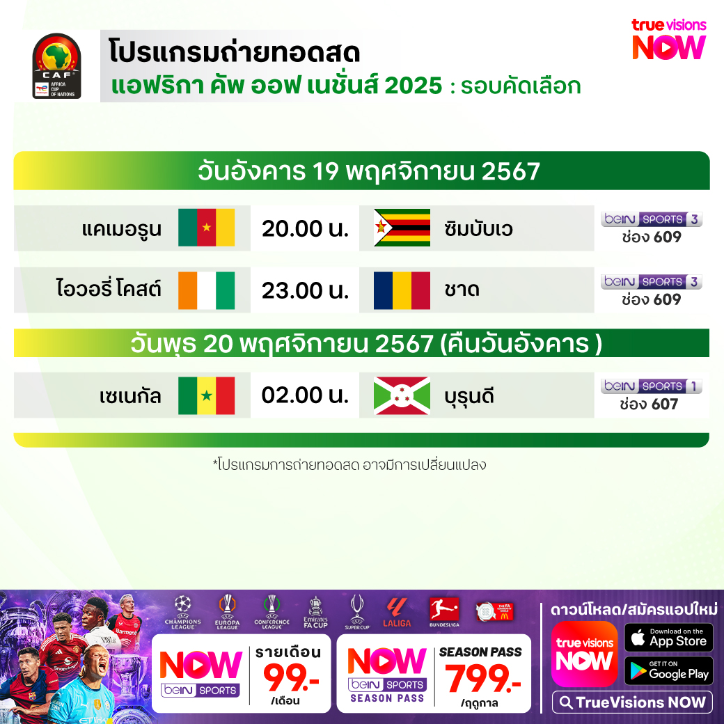 วันนี้มีอะไรดูที่ ทรูวิชั่นส์ ประจำวันอังคารที่ 19 พฤศจิกายน 67 ยังคงมีกีฬาที่น่าสนใจให้ได้ตามลุ้นตามเชียร์กันเหมือนเดิม ในส่วนของฟุตบอลนั้นยังมีศึกแอฟริกา คัพ ออฟ เนชั่นส์ รอบคัดเลือก ให้ได้ตามเชียร์กันต่อ รวมถึงศึกช้าง เอฟเอ คัพ ส่วนกีฬาอื่นๆ ยังมีศึกเทนนิส เดวิส คัพ ไฟนอลส์ 2024 งานนี้ ทรูวิชั่นส์ จัดเต็มให้ชมกันถึงบ้าน