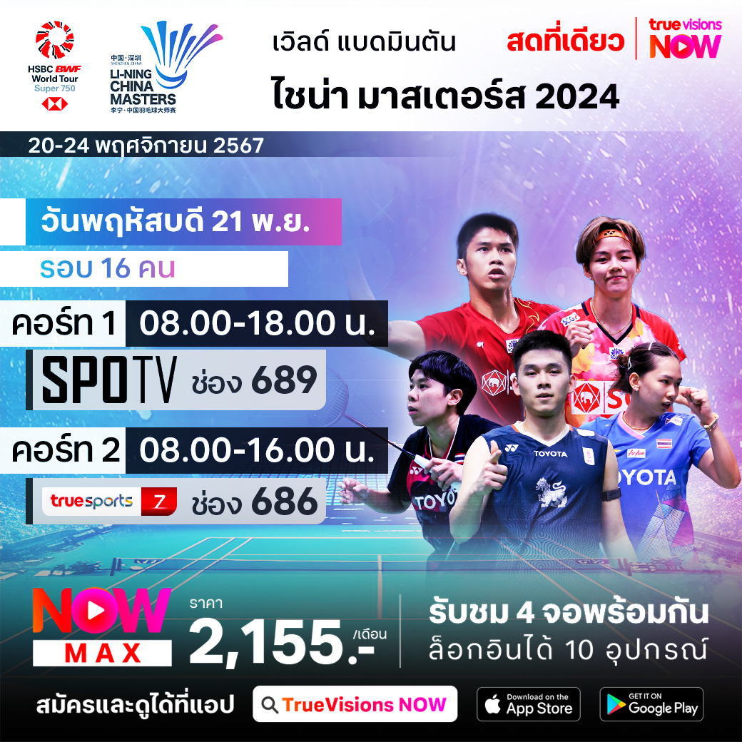 มันส์แน่นอน เมื่อสุดยอดนักตบลูกขนไก่ชั้นนำของโลกจากทุกทวีป บุกไปสร้างผลงานและลุ้นตำแหน่งแชมป์กับนักแบดมินตันระดับโลกของจีนแผ่นใหญ่ในฐานะเจ้าบ้าน ในรายการ ไชน่า มาสเตอร์ส ศึกแห่งศักดิ์ศรีระดับ เวิลด์ ทัวร์ ซูเปอร์ 750 ที่เสิ่นเจิ้น ประเทศจีน ชิงเงินรางวัลรวม 1,150,000 เหรียญสหรัฐฯ ร่วมส่งใจเชียร์ทีมแบดมินตันไทย สู้สุดใจเพื่อชัยชนะ ชมสด เอ็กซ์คลูซีฟ ที่เดียว ที่ ทรูวิชั่นส์