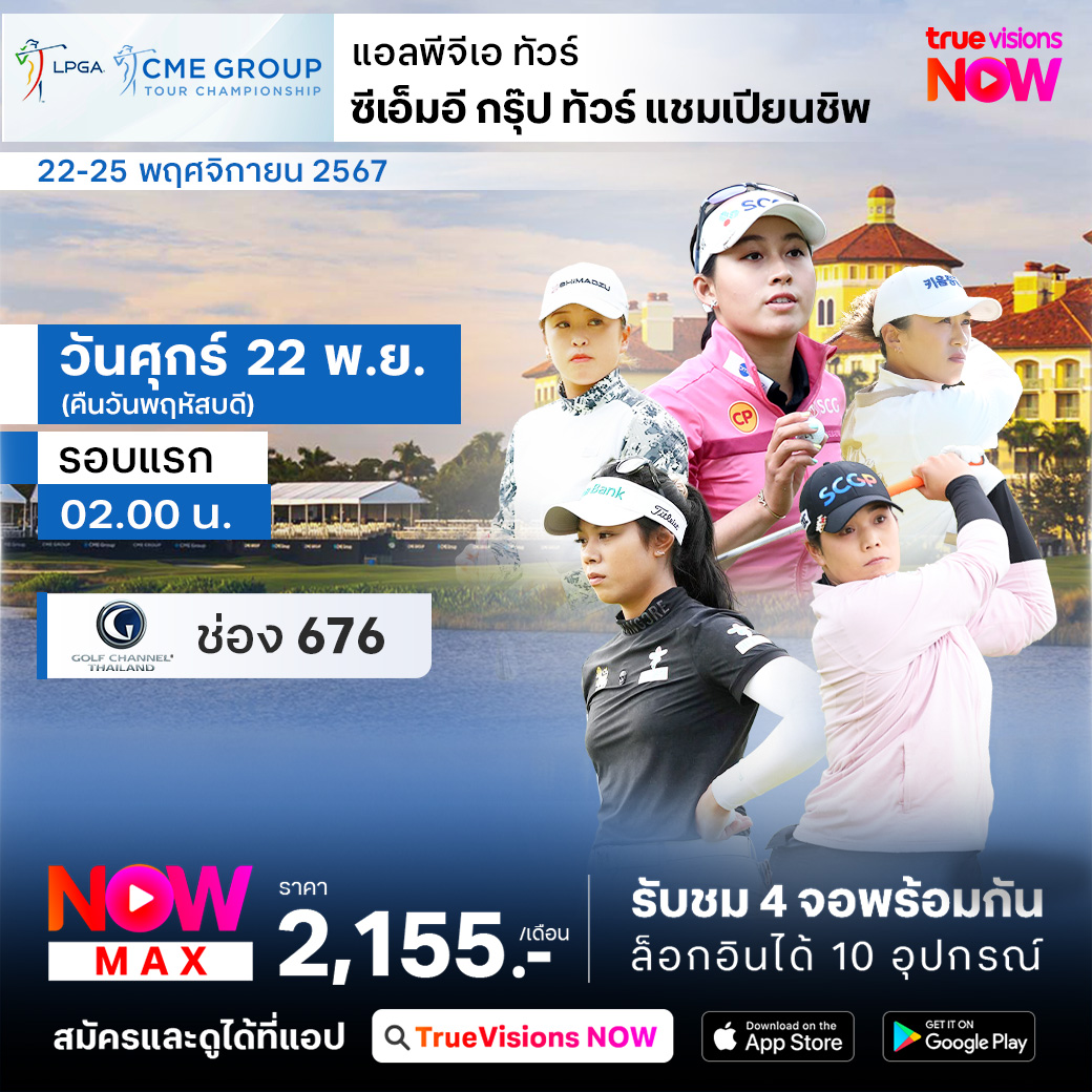 กอล์ฟหญิง แอลพีจีเอ ทัวร์ รายการที่ทุกคนรอคอยการมาถึงแล้ว กับความสนุกตื่นเต้นที่โปรกอล์ฟหัวแถวของทัวร์ ตบเท้าเข้าร่วมชิงชัยในรายการ ซีเอ็มอี กรุ๊ป ทัวร์ แชมเปี้ยนชิพ โทรฟี่แห่งศักด์ศรี เงินรางวัลรวมมหาศาล 11,000,000 เหรียญสหรัฐฯ และ โบนัส รวมถึงรางวัลเกียรติยศแห่งปีที่จะแจกกันในสัปดาห์นี้ ร่วมเชียร์โปรสาวไทยสู้กับโปรจากทั่วโลก ชมสด ครบทุกรอบ ที่ ทรูวิชั่นส์