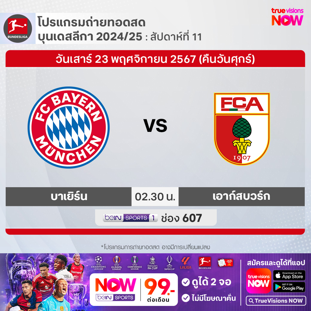 Bayern vs Augsburg เวลา 02.30-04.30 ทางช่อง beIN 1 (607)