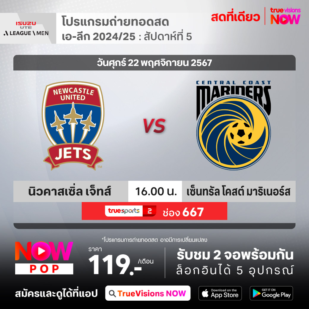 Newcastle Jets vs Central Coast Mariners เวลา 16.00-18.00 ทางช่อง TS 2 (667)