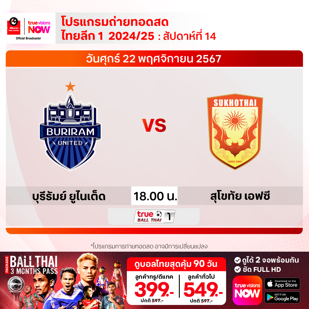 BURIRAM UNITED vs SUKHOTHAI FC เวลา 18.00-20.00 ทางช่อง True Ball Thai 1