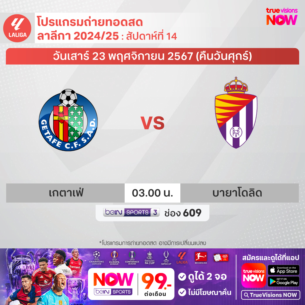 Getafe vs Valladolid เวลา 03.00-05.00 ทางช่อง beIN 3 (609)