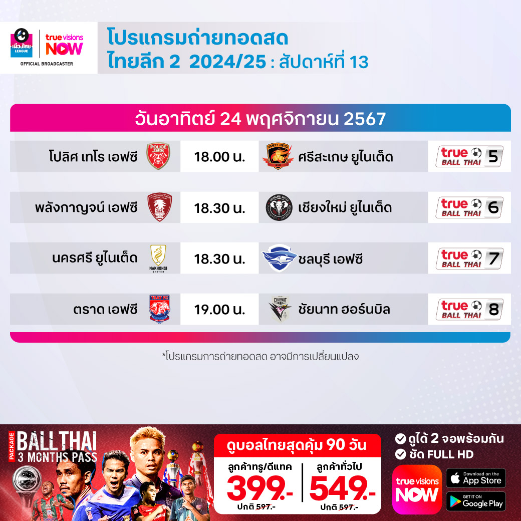 โปลิศ เทโร เอฟซี พบ ศรีสะเกษ ยูไนเต็ด เวลา 18.00-20.00 ทางช่อง True Ball Thai 5