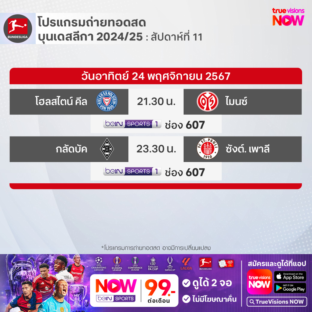 Monchengladbach vs St. Pauli เวลา 23.30-01.30 ทางช่อง beIN 1 (607)