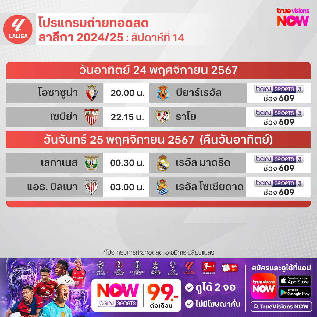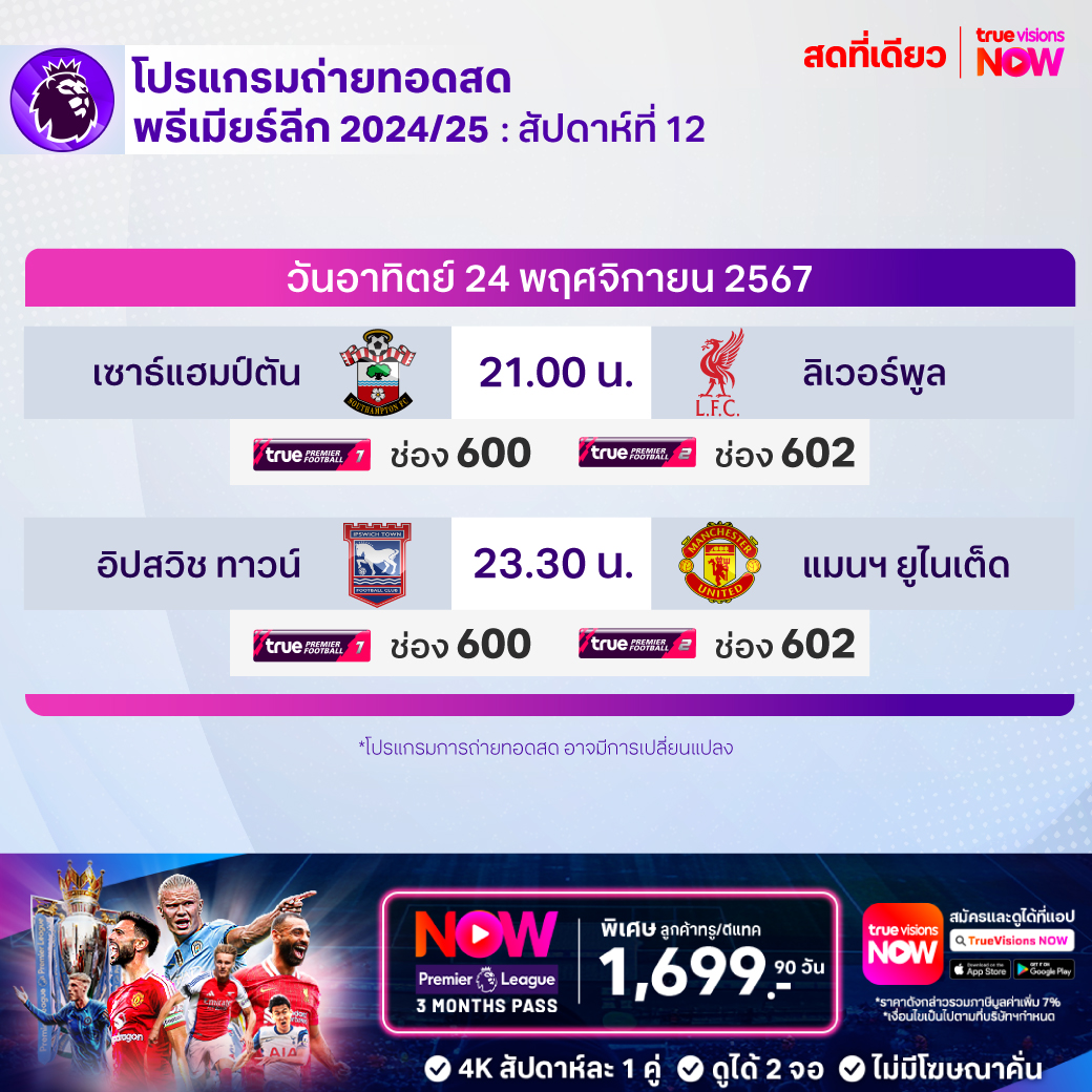 วันนี้มีอะไรดูที่ ทรูวิชั่นส์ ประจำวันอาทิตย์ที่ 24 พฤศจิกายน 67 ยังคงมีกีฬาที่น่าสนใจให้ได้ตามลุ้นตามเชียร์กันเหมือนเดิม โดยในส่วนของฟุตบอลนั้น ยังมีศึกพรีเมียร์ลีก อังกฤษ, บุนเดสลีกา เยอรมนี, ลา ลีกา สเปน, ซาอุดิ โปร ลีก และ ไทยลีก 1, 2 ให้ได้ตามเชียร์กันอย่างต่อเนื่อง ส่วนกีฬาอื่นๆ ยังมีศึกฟอร์มูล่า วัน รายการ ลาส เวกัส กรังด์ปรีซ์, เทนนิส เดวิส คัพ ไฟนอลส์ 2024, กอล์ฟ พีจีเอ ทัวร์ รายการ เดอะ อาร์เอสเอ็ม คลาสสิก, ดีพี เวิลด์ ทัวร์ รายการ ออสเตรเลียน พีจีเอ แชมเปี้ยนชิพ, แอลพีจีเอ ทัวร์ รายการ ซีเอ็มอี กรุ๊ป ทัวร์ แชมเปี้ยนชิพ, เวิลด์ สนุกเกอร์ ทัวร์ รายการ ยูเค แชมเปี้ยนชิพ, แบดมินตัน บีดับเบิ้ลยูเอฟ รายการ ไชน่า มาสเตอร์ส, รักบี้ ออทัม เนชั่นส์ ซีรี่ส์, วอลเลย์บอล เอสวี ลีก, ศึกบาสเกตบอลเอ็นบีเอ และ อเมริกันฟุตบอลเอ็นเอฟแอล งานนี้ ทรูวิชั่นส์ จัดเต็มให้ชมกันถึงบ้าน