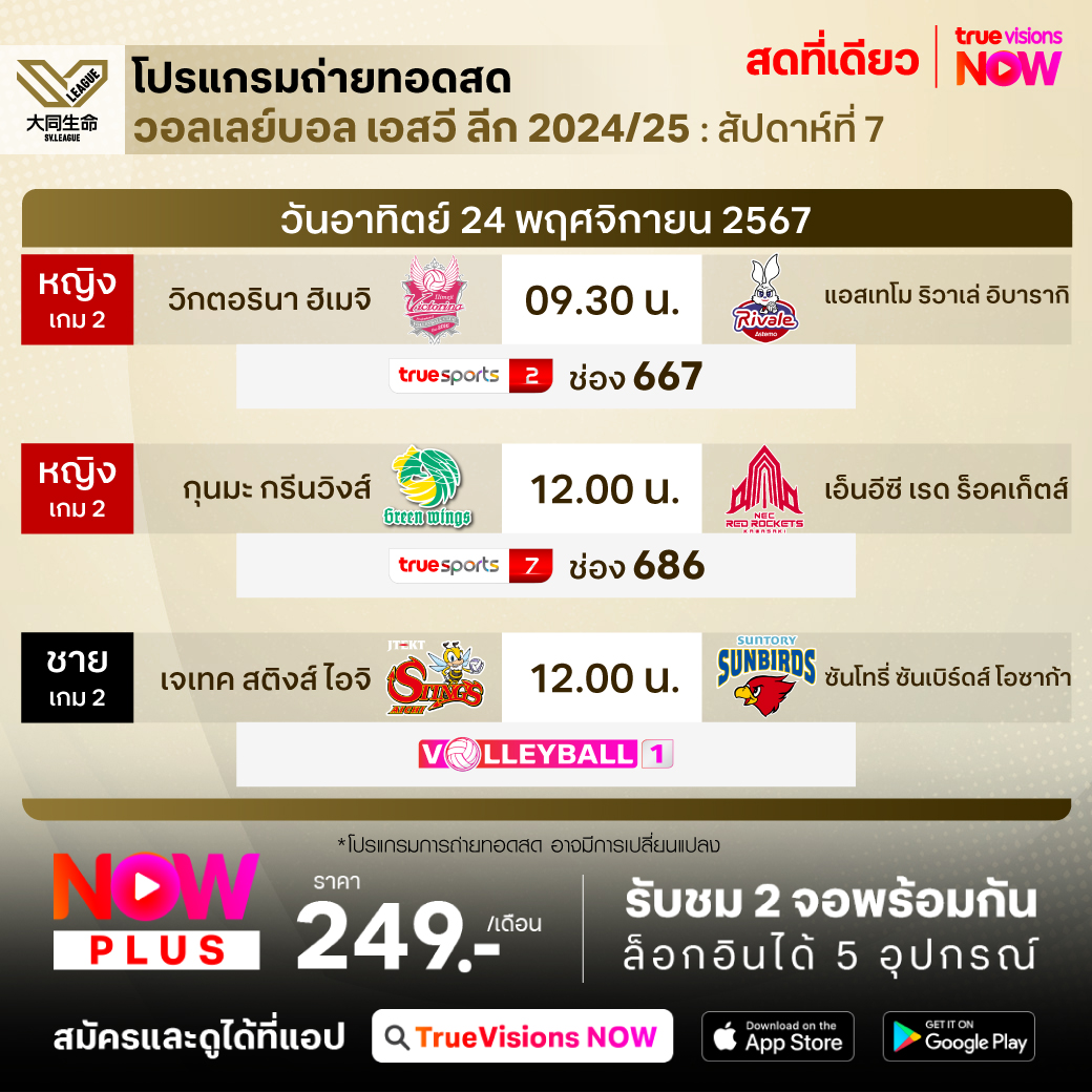 เจเทค สติงส์ ไอจิ พบ ซันโทรี่ ซันเบิร์ดส์ โอซาก้า เวลา 12.00 ทางช่อง Volleyball 1