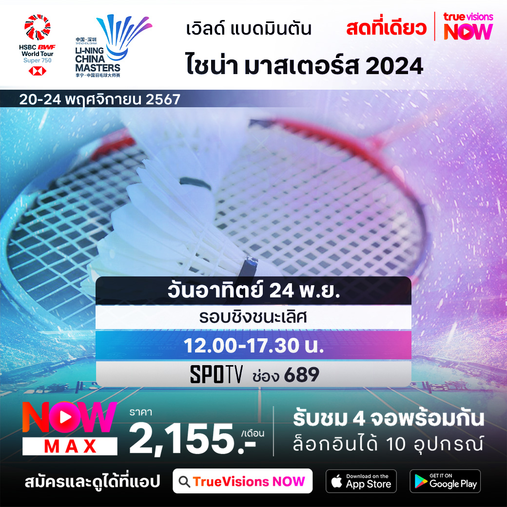 แบดมินตันระดับ เวิลด์ ทัวร์ ซูเปอร์ 750 รายการ ไชน่า มาสเตอร์ส 2024 ชิงเงินรางวัลรวม 1,150,000 เหรียญสหรัฐฯ เข้าสู่รอบชิงชนะเลิศ ใครคว้าแชมป์รายการนี้ไปครอง ชมสด เอ็กซ์คลูซีฟ ที่เดียวที่ ทรูวิชั่นส์