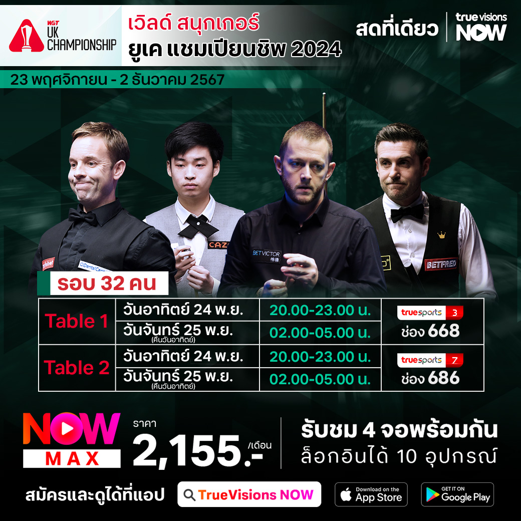 ยิ่งใหญ่เกินที่แฟนๆ จะพลาดได้ สำหรับ เวิลด์ สนุกเกอร์ ทัวร์ รายการเก็บคะแนนสะสมโลก ยูเค แชมเปี้ยนชิพ หนึ่งในรายการเมเจอร์ระดับ ทริปเปิ้ล คราวน์ ซีรี่ส์ ปีนี้ มือดีระดับท็อป 16 คนของโลกเป็นตัวยืน รอดวลคิวเพื่อตำแหน่งแชมป์และเงินรางวัลมหาศาล นำโดยแชมป์เก่า รอนนี่ โอซัลลิแวน, จั๊ดด์ ทรัมป์ และ แชมป์โลกคนล่าสุด ไคเรน วิลสัน ชมสด ครบทุกแมตช์ เอ็กซ์คลูซีฟจาก ยอร์ค บาคิแคน ประเทศอังกฤษ ที่เดียว ที่ ทรูวิชั่นส์