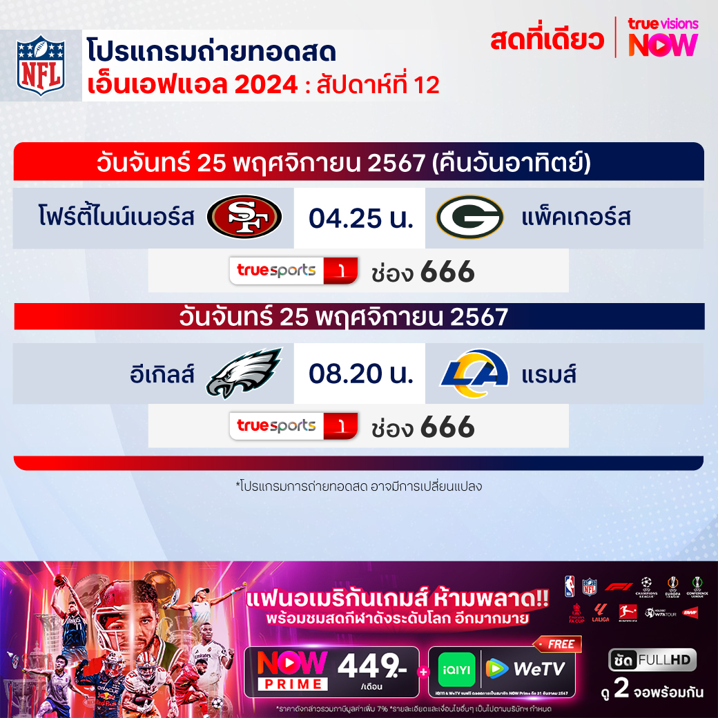 วันศุกร์ 25 พ.ย. Eagles Vs Rams เวลา 08.20 ทางช่อง TS 1 (666)