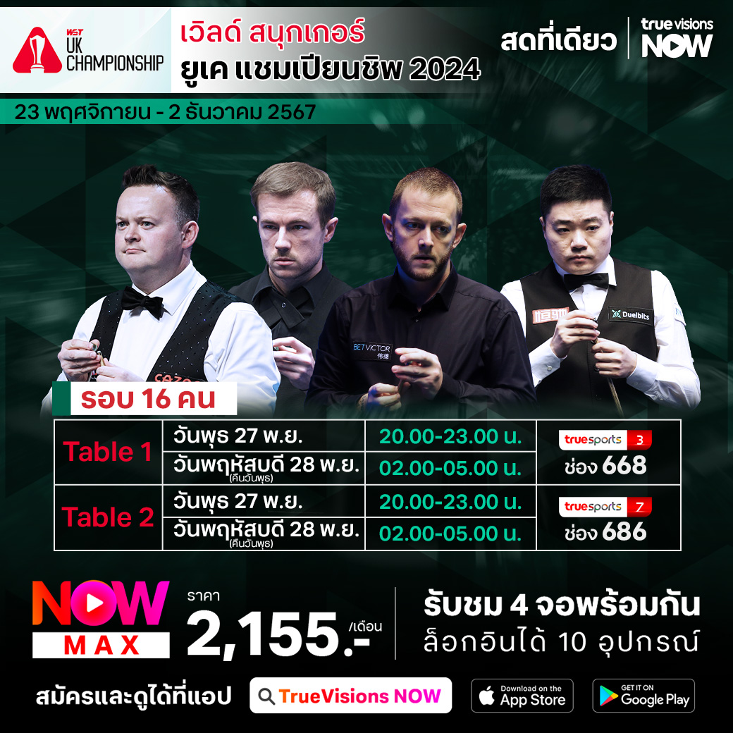 เวิลด์ สนุกเกอร์ ทัวร์ รายการเก็บคะแนนสะสมโลก ยูเค แชมเปี้ยนชิพ หนึ่งในรายการเมเจอร์ระดับ ทริปเปิ้ล คราวน์ ซีรี่ส์ ปีนี้ มือดีระดับท็อป 16 คนของโลกเป็นตัวยืน รอดวลคิวเพื่อตำแหน่งแชมป์และเงินรางวัลมหาศาล ชมสด ครบทุกแมตช์ เอ็กซ์คลูซีฟจาก ยอร์ค บาคิแคน ประเทศอังกฤษ ที่เดียว ที่ ทรูวิชั่นส์