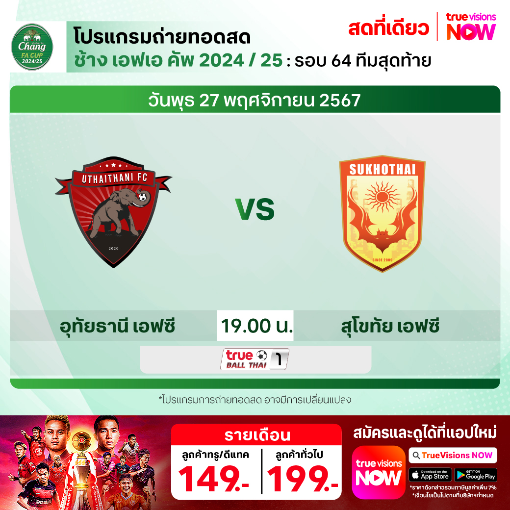 อุทัยธานี เอฟซี พบ สุโขทัย เอฟซี เวลา 19.00-21.00 ทางช่อง True Ball Thai 1