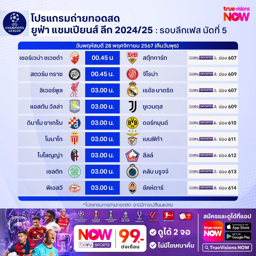 วันนี้มีอะไรดูที่ ทรูวิชั่นส์ ประจำวันพุธที่ 27 พฤศจิกายน 67 ยังคงมีกีฬาที่น่าสนใจให้ได้ตามลุ้นตามเชียร์กันเหมือนเดิม โดยในส่วนของฟุตบอลนั้น ยังมีศึก ยูฟ่า แชมเปี้ยนส์ ลีก รอบ ลีก เฟส และ ช้าง เอฟเอ คัพ ให้ได้ตามเชียร์กันอย่างต่อเนื่อง ส่วนกีฬาอื่นๆ ยังมีศึกเวิลด์ สนุกเกอร์ ทัวร์ รายการ ยูเค แชมเปี้ยนชิพ และบาสเกตบอลเอ็นบีเอ งานนี้ ทรูวิชั่นส์ จัดเต็มให้ชมกันถึงบ้าน