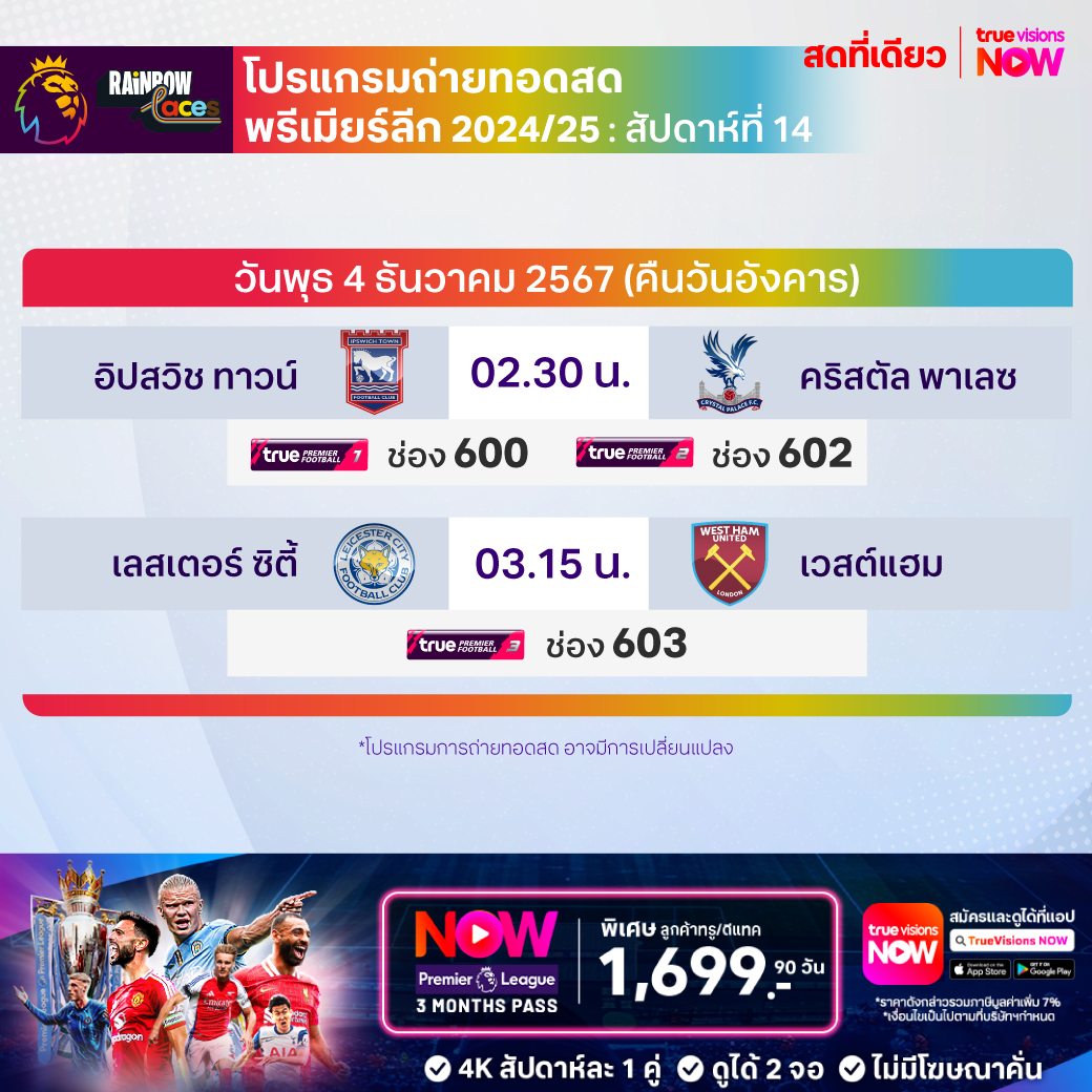 Leicester City vs West Ham Utd เวลา 03:15 - 05:15 ทางช่องTPF 3(603)