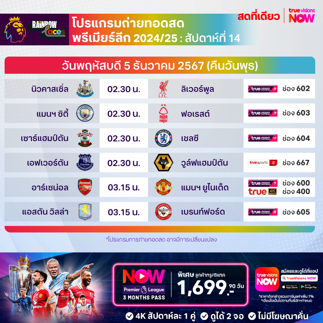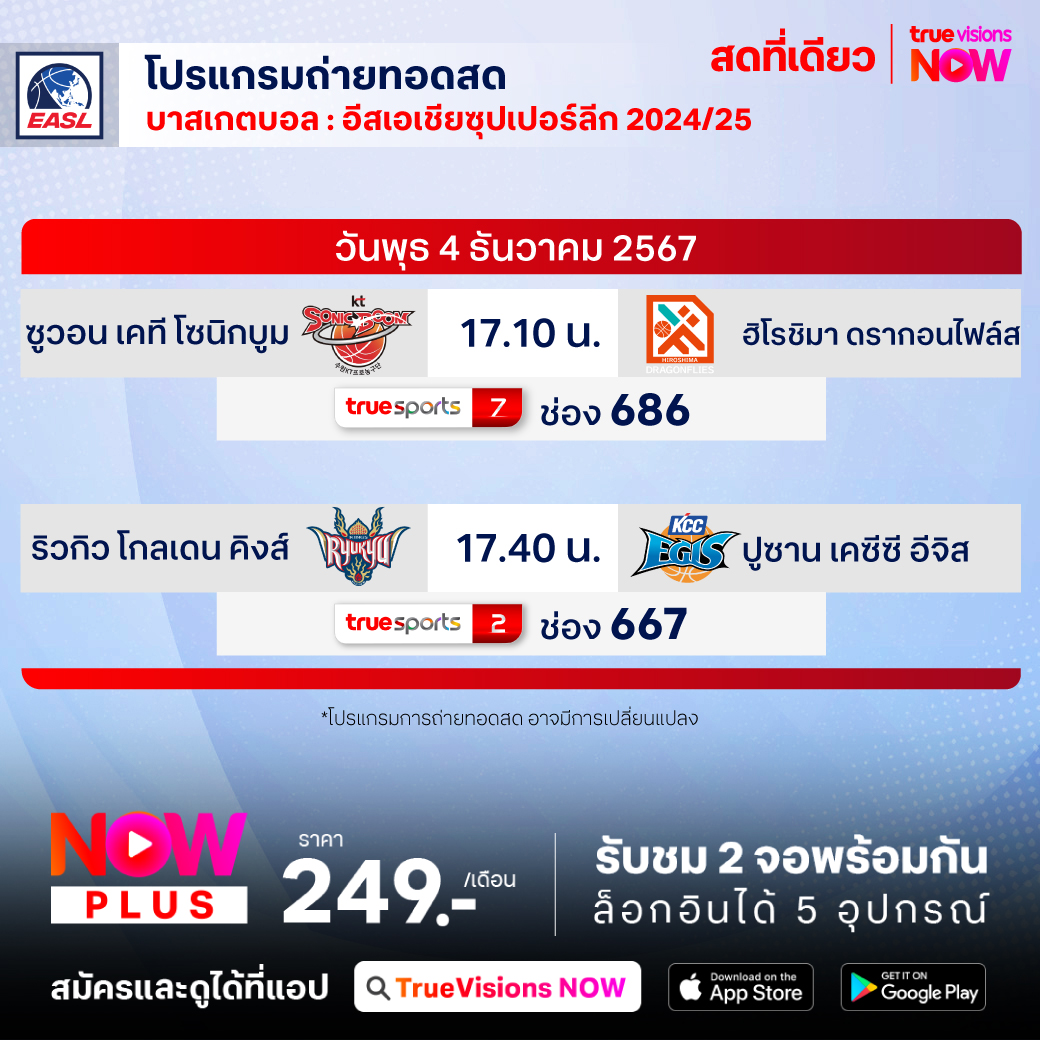 วันนี้มีอะไรดูที่ ทรูวิชั่นส์ ประจำวันพุธที่ 4 ธันวาคม 67 ยังคงมีกีฬาที่น่าสนใจให้ได้ตามลุ้นตามเชียร์กันเหมือนเดิม โดยในส่วนของฟุตบอลนั้น ยังมีศึกพรีเมียร์ลีก อังกฤษ และ ลา ลีกา สเปน ให้ได้ตามเชียร์กันอย่างต่อเนื่อง ส่วนกีฬาอื่นๆ ยังมีศึก เวิลด์ สนุกเกอร์ ทัวร์ รายการ ชู๊ตเอาท์ 2024, บาสเกตบอล อีสต์ เอเชีย ซูเปอร์ลีก และบาสเกตบอลเอ็นบีเอ งานนี้ ทรูวิชั่นส์ จัดเต็มให้ชมกันถึงบ้าน