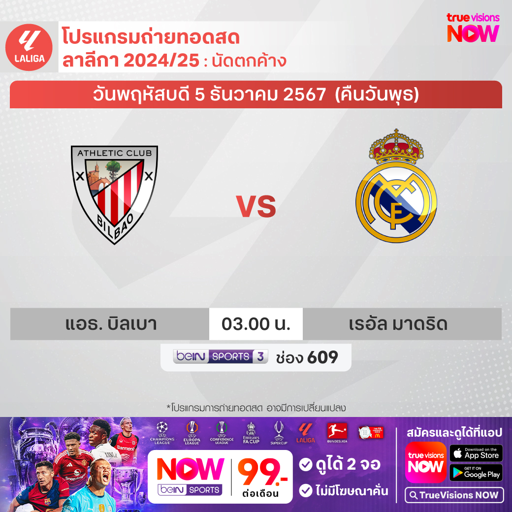 Athletic Bilbao vs Real Madrid เวลา 03.00-05.00 ทางช่อง beIN 3 (609)