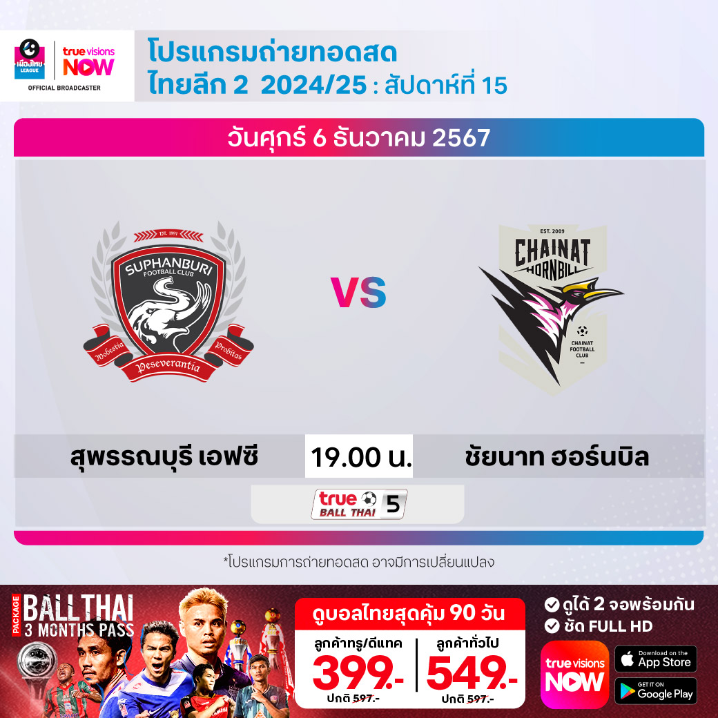 สุพรรณบุรี เอฟซี พบ ชัยนาท ฮอร์นบิล เวลา 19.00-21.00 ทางช่อง True Ball Thai 5
