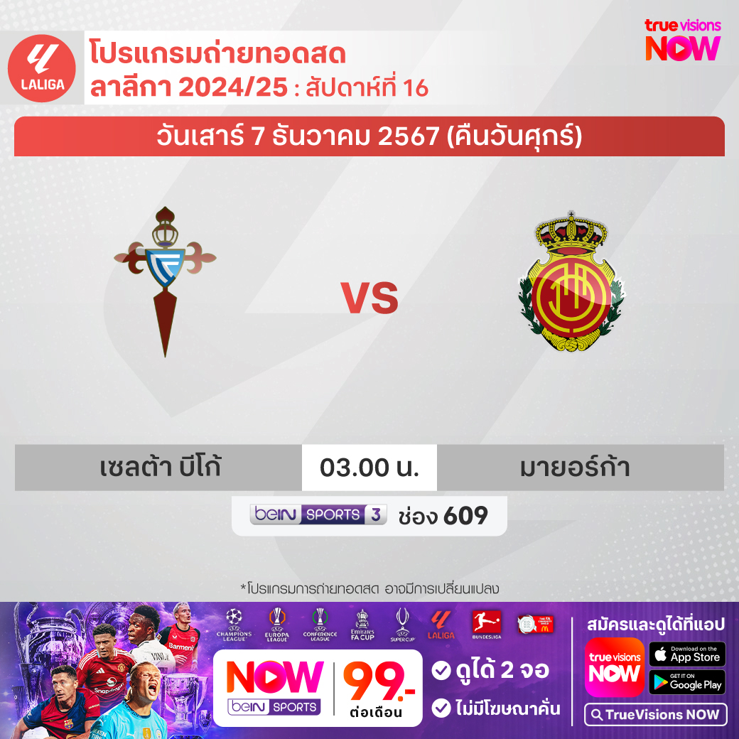 Celta Vigo vs Mallorca เวลา 03.00-05.00 ทางช่อง beIN 3 (609)