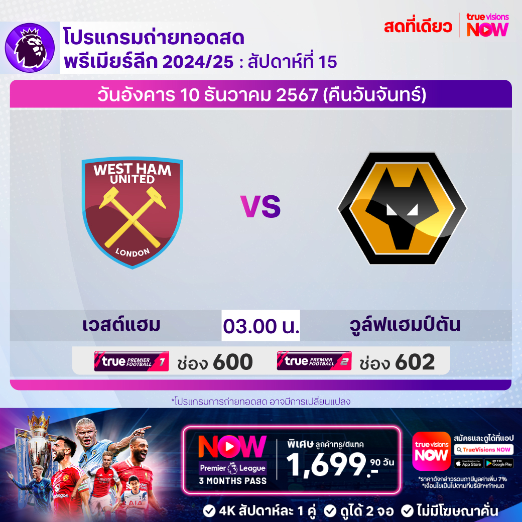 West Ham Utd vs Wolverhampton เวลา 03:00 - 05:00 ทางช่อง TPF 1 (600) / TPF 2 (602)