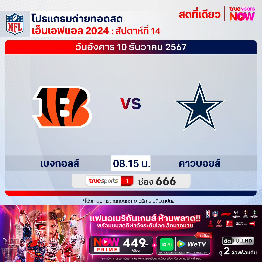 วันอังคาร 10 ธ.ค. Bengals Vs Cowboys เวลา 08.15 ทางช่อง TS 1 (666)