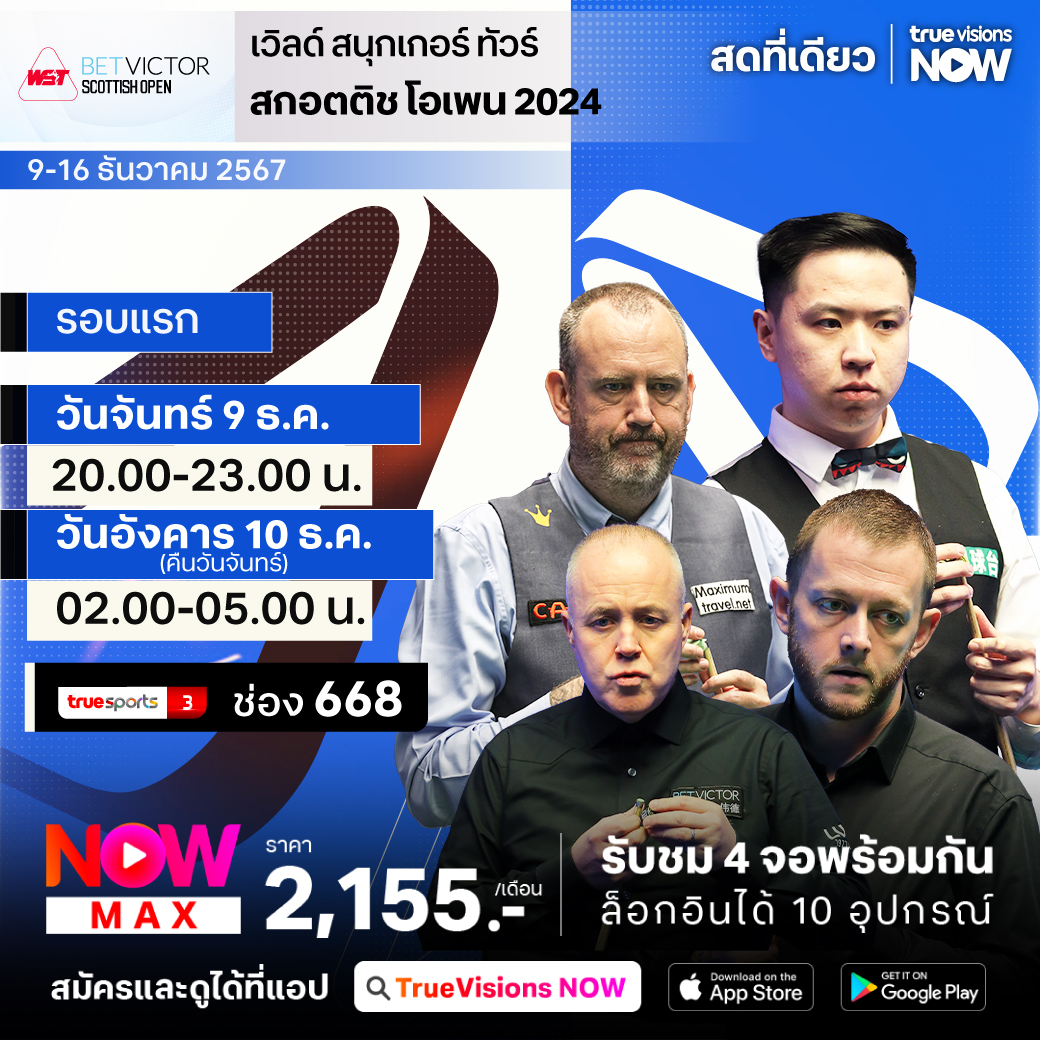 แฟนๆ กีฬาสอยคิวต้องไม่พลาด กับ เวิลด์ สนุกเกอร์ ทัวร์ เก็บคะแนนสะสมโลก รายการ สกอตติช โอเพ่น ที่เป็น 1 ใน 4 ของ โฮม เนชั่นส์ ซีรี่ส์ ที่มีนักสนุกเกอร์เข้าร่วมแข่งขันแย่งชิงตำแหน่งแชมป์และรางวัลโบนัสก้อนโตมากถึง 128 คน ที่สังเวียน มีโดว์แบงค์ เซนเตอร์ ใน เอดินบะระ สกอตแลนด์ ร่วมลุ้นกันว่า ใครจะได้แชมป์ไปครอง พร้อมกับ สตีเฟ่น เฮนดรี้ โทรฟี่ ชมสด เอ็กซ์คลูซีฟ ครบทุกรอบ ที่เดียวที่ ทรูวิชั่นส์