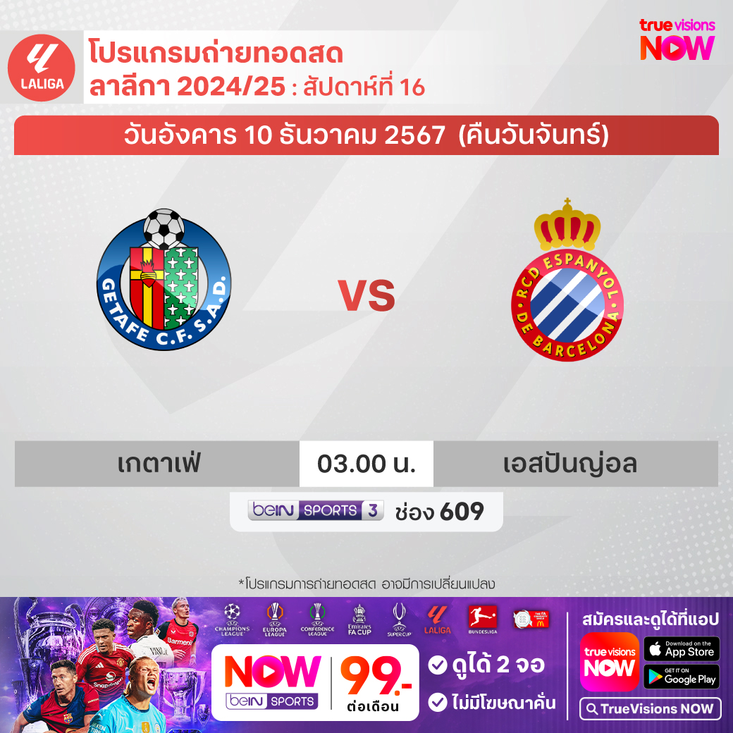 Getafe vs Espanyol เวลา 03.00-05.00 ทางช่อง beIN 3 (609)