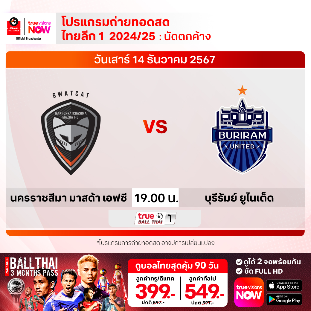 นครราชสีมา มาสด้า เอฟซี พบ บุรีรัมย์ ยูไนเต็ด เวลา 19.00-21.00 ทางช่อง True Ball Thai 1